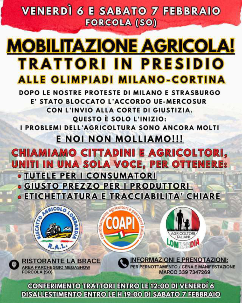 “Mentre il mondo guarda gli atleti sulle piste di Bormio” si legge nel documento “noi scendiamo in campo per far conoscere la nostra situazione e denunciare l’ipocrisia delle istituzioni. L’Europa continua a svendere la nostra eccellenza e la nostra salute con accordi di libero scambio, aprendo le porte a prodotti senza controlli e a prezzi stracciati. Noi rispondiamo con una mobilitazione pacifica e simbolica, per far sentire la nostra voce.
