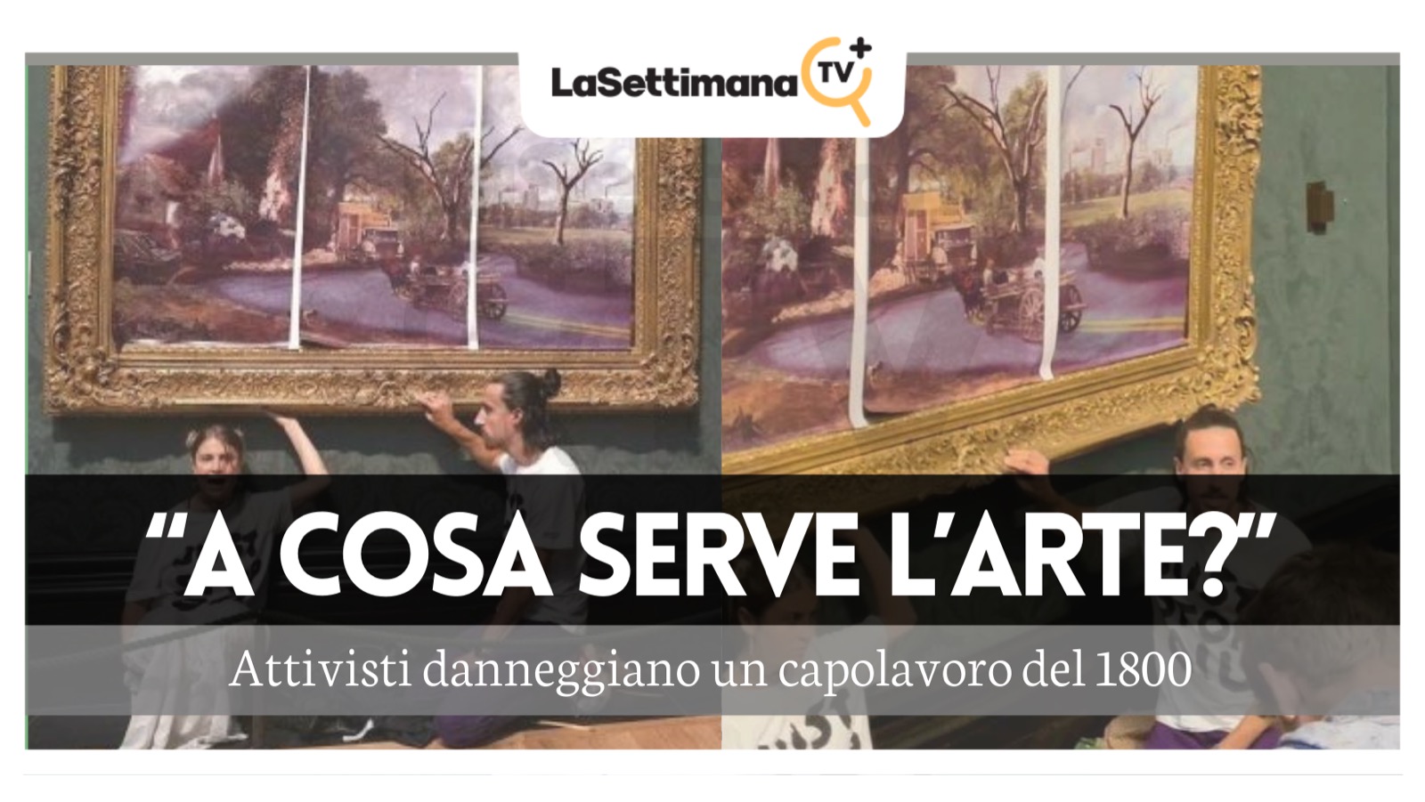 Due ventenni di Brighton si sono recati alla National Gallery di Londra per incollarsi letteralmente alla cornice di un quadro di Constable,“Il carro di fieno”, 1821, dopo averlo coperto con una finta tela che lo trasformava in dipinto distopico, con carcasse di automobili e fiumi asfaltati.