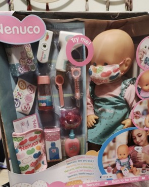 La bambola Nenuco è alta 35 centimetri e vestita di blu e di rosa. Tutto normale se non fosse per gli accessori di cui si compone la confezione che la contiene. Dal “test per vedere se è malato oppure no” che ricorda molto un tampone Covid fai-da-te, alla mascherina colorata; dal termometro alle siringhe.