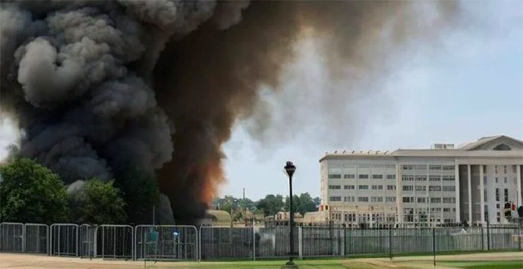 Nell’immagine si vede un’enorme colonna di fumo che avvolge tutto quello che si trova nelle vicinanze, mentre alla sua destra c’è un edificio spaventosamente simile al Dipartimento della difesa degli Stati Uniti d’America che si trova a Washington.