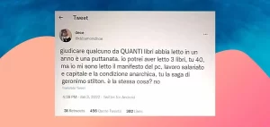 “Giudicare qualcuno da QUANTI libri abbia letto in un anno è una puttanata. Io potrei aver letto 3 libri, tu 40, ma io mi sono letto il manifesto del pc, lavoro salariato e capitale e la condizione anarchica, tu la saga di Geronimo Stilton. E’ la stessa cosa? NO.”