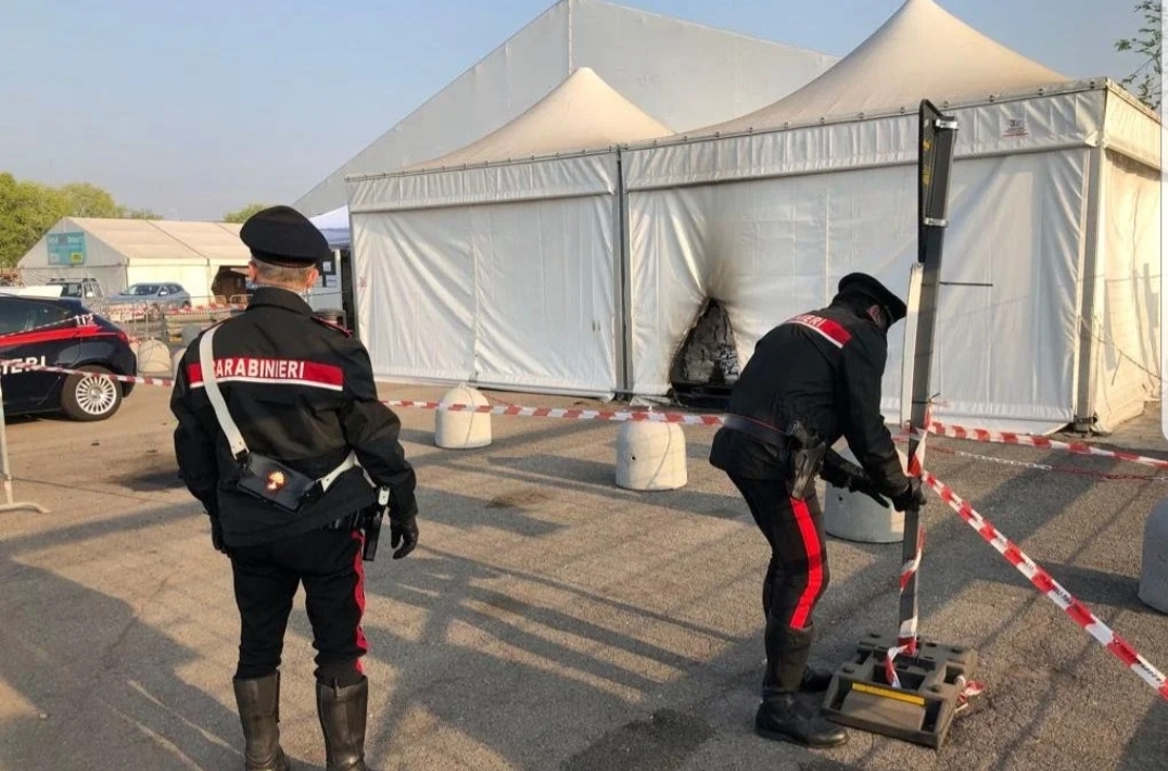 La tensostruttura è stata incendiata da due bottiglie incendiarie e, il fuoco è divampato anche sulla mensa degli operatori, senza creare danni.