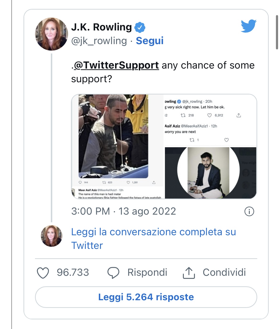 La Rowling in un tweet aveva mostrato vicinanza a Rushdie scrivendo: “Terribile. pero che Salman stia bene”. Tra le risposte, è comparso un commento che minacciava l’autrice: “Non preoccuparti, la prossima a morire sarai tu”.