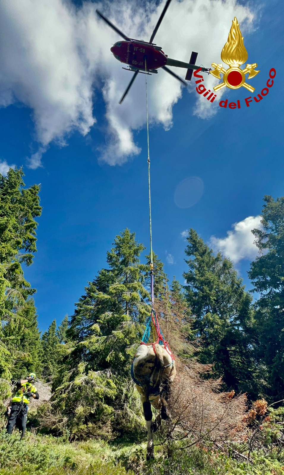 Le forze dell’ordine hanno imbragato la mucca e l’hanno recuperata grazie all’elicottero “Drago 59” del reparto volo di Venezia, che l’ha sollevata grazie a un gancio baricentrico e spostata in una zona sicura.