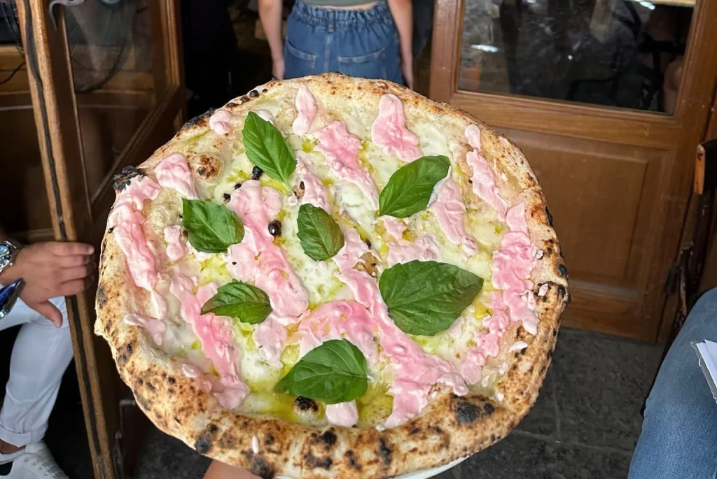 Il processo per ottenere la “salsa” rosa della pizza in realtà è molto semplice: il pizzaiolo non ha fatto altro che miscelare ricotta di bufala DOP e salsa di pomodori di San Marzano, aggiungendo poi fiordilatte e foglie di basilico. In verità, il pizzaiolo aveva già realizzato una pizza simile nel 2018, quando la Mattel decise di lanciare sul mercato “Barbie Pizzaiola”.
